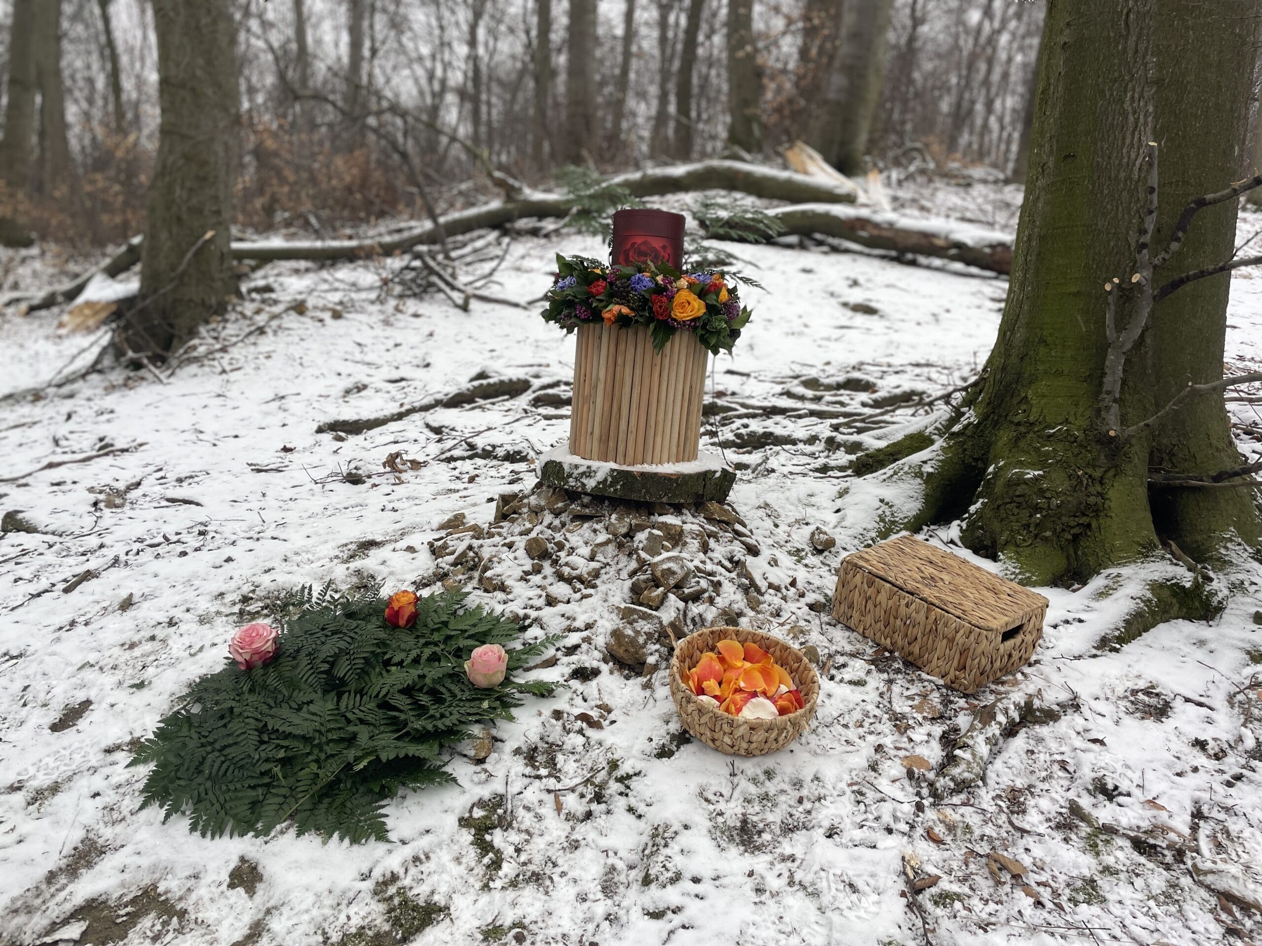 Nachdem Sie bei uns die nötigen Formalitäten zu Ihrem Sterbefall in einer ruhigen Atmosphäre besprochen haben, findet die Baumauswahl mit dem Betreiber direkt im Wald statt. Die Gestaltung und Durchführung der Trauerfeier führen wir in enger Absprache mit Ihnen ganz persönlich und individuell durch. Wir gehen hierbei auf all Ihre Bedürfnisse und Wünsche ein. Wir achten hier besonders auf die Feinheiten und versuchen auch ausgefallene Wünsche zu ermöglichen um den Abschied etwas positiv zu gestalten.