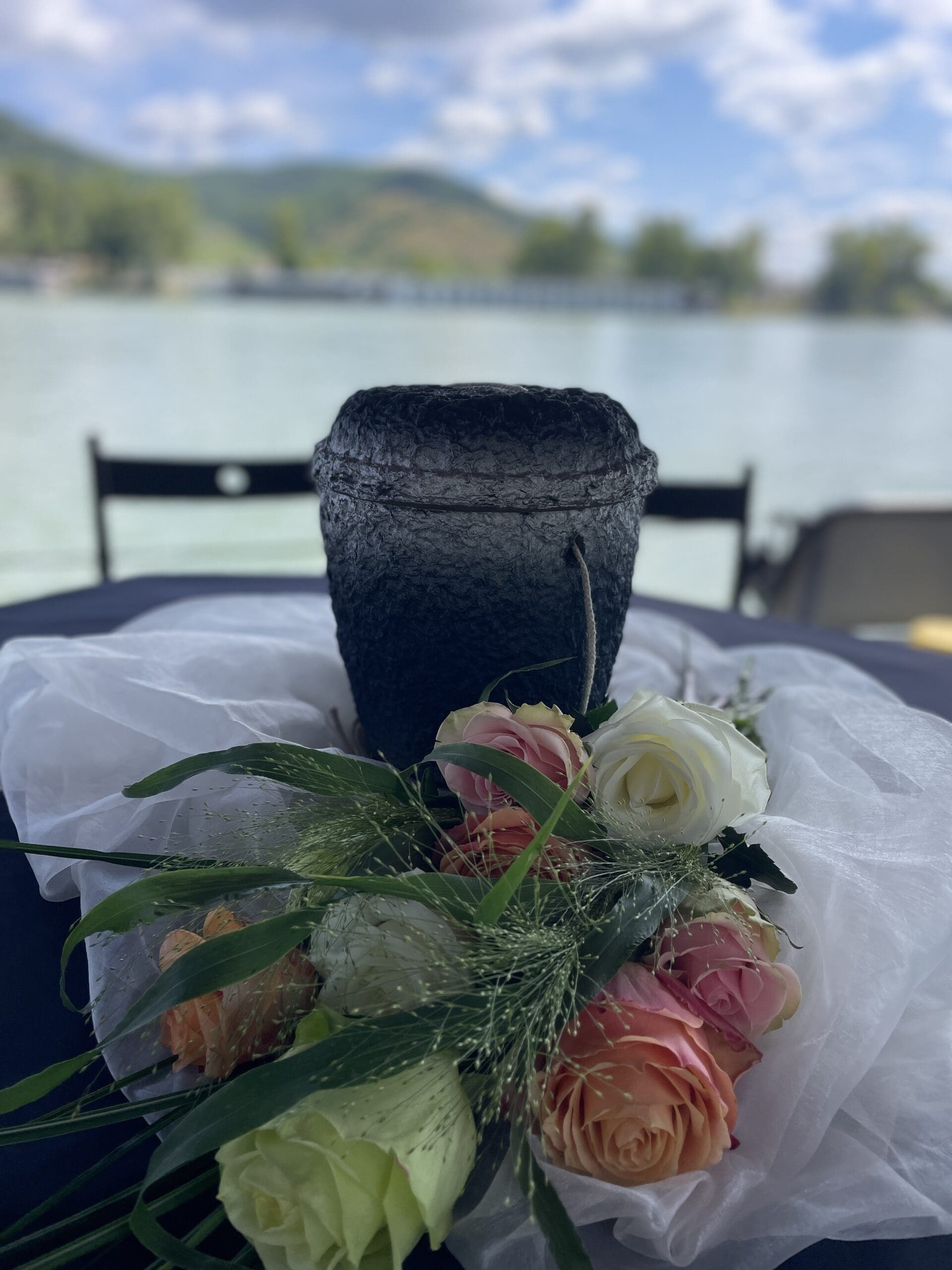 Die Asche wird in einer speziellen Urne der Donau in N.Ö an bestimmten Stellen auf Rosen-Blütenblättern gebettet, übergeben. Mit aller Würde und Ehre für den Vorausgegangenen – mit Musik und Ansprache, Schiffssirenen-Salut und einem Blütenteppich auf dem Wasser, so kann auf Wunsch eine Verabschiedung gestaltet werden. Die Urne löst sich nach einiger Zeit im Wasser auf und die Asche erhält die Freiheit.