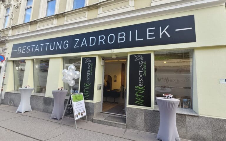 „Unser Team besteht aus langjährigen, erfahrenen, liebevollen Menschen, welche stets um Ihr Wohlbefinden bemüht sind. Seit 20 Jahren unterstützen wir mit Einfühlungsvermögen und Feingefühl Familien. Wir führen den kompletten Sterbefall – Abholung vom Sterbeort, Trauerfeier und Naturbestattung – in enger Abstimmung mit Ihnen durch.“ Geschäftsführung Marlies Zadrobilek und Pionierin der Naturbestattung Elisabeth Zadrobilek.